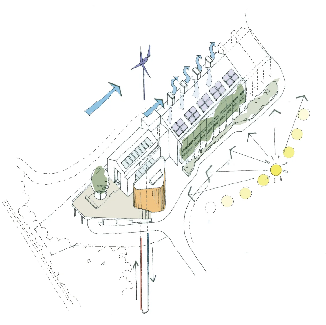 The sustainability strategy achieved a BREEAM 'Very Good' rating and combined natural ventilation, ground source heat pumps, and concrete soffits that provide thermal mass and are exposed as part of the interior scheme .